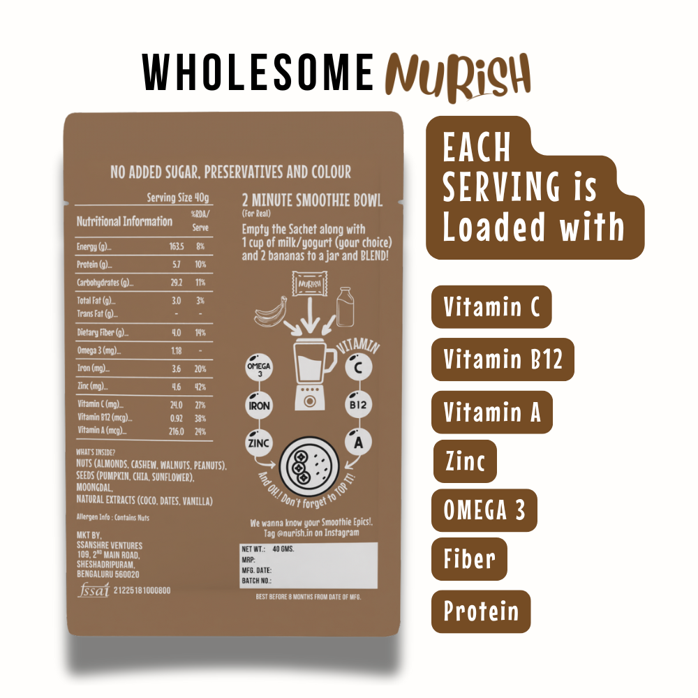 Your new breakfast buddy, pre-workout boost, and 3 AM craving fix—all in one pack. Packed with nuts, seeds & superfoods, it’s clean, tasty, and keeps you going. Just blend, sip, and feel good.